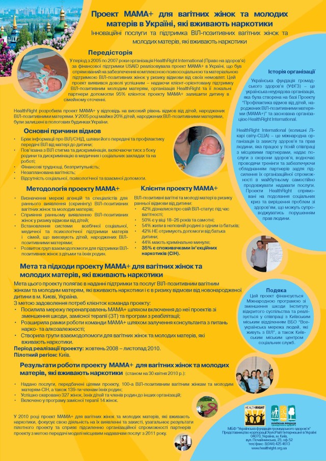 На основі дослідження «Від політики до практики: дослідження процедури тестування на ВІЛ-інфекцію вагітних жінок в Україні», а також подальших обговорень під час круглих столів на теми доступу вагітних жінок вразливих груп до антенатальних медичних послуг, “Право на здоров’я” (HealthRight International) та Українська фундація громадського здоров`я уклали два короткі зведення. Перше присвячене практикам та досвіду вагітних жінок під час тестування на ВІЛ, перед і післятестового консультування. Друге – торкається прав наркозалежних вагітних жінок в контексті тестування на ВІЛ та доступу до антенатальної допомоги. Ці зведення будуть корисними для представників громадських організацій, які планують і проводять адвокаційні кампанії щодо підвищення рівня обізнаності медичних працівників, а також для управлінців, які приймають рішення щодо усунення прогалин між законодавством та його практичною реалізацією.